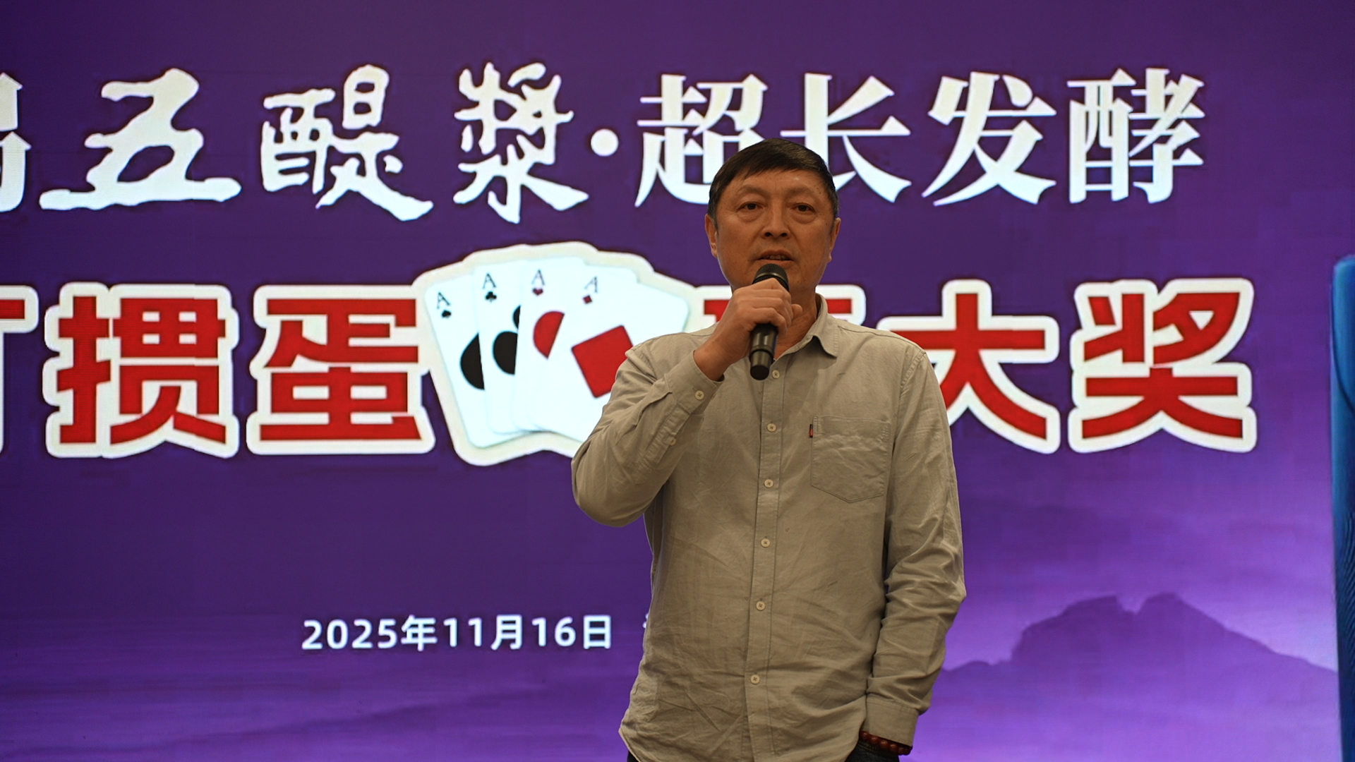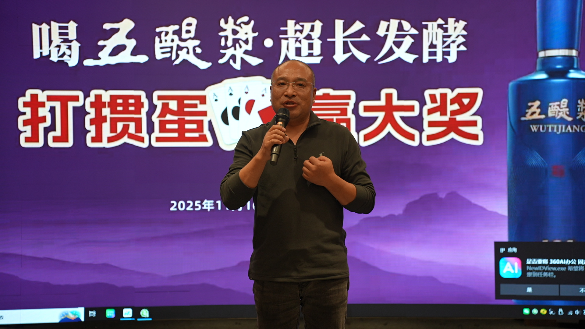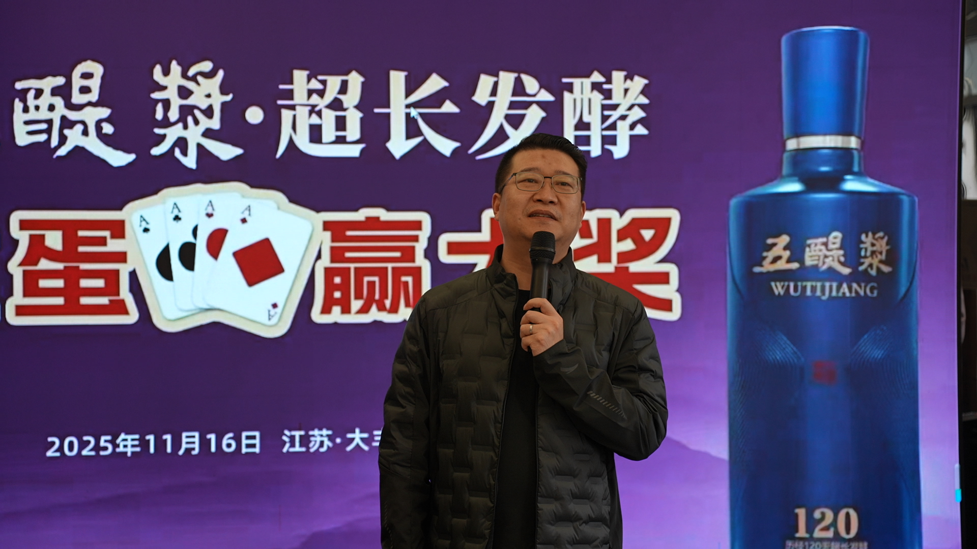 在热烈的掌声中,五醍浆酒业副总经理赵大庆登台致辞。他表示:“超长发酵作为五醍浆核心产品系列之一,自上市以来在盐城各区域均表现亮眼。大丰是五醍浆高度重视的战略市场,有了各位伙伴的信任与支持,我们有信心在这里扎根更深、走得更远。未来,我们将持续开展‘喝五醍浆中黄金’、五醍浆掼蛋比赛等丰富多彩的活动,让大家在品味美酒的同时,更能感受到五醍浆的品牌温度与企业文化。”