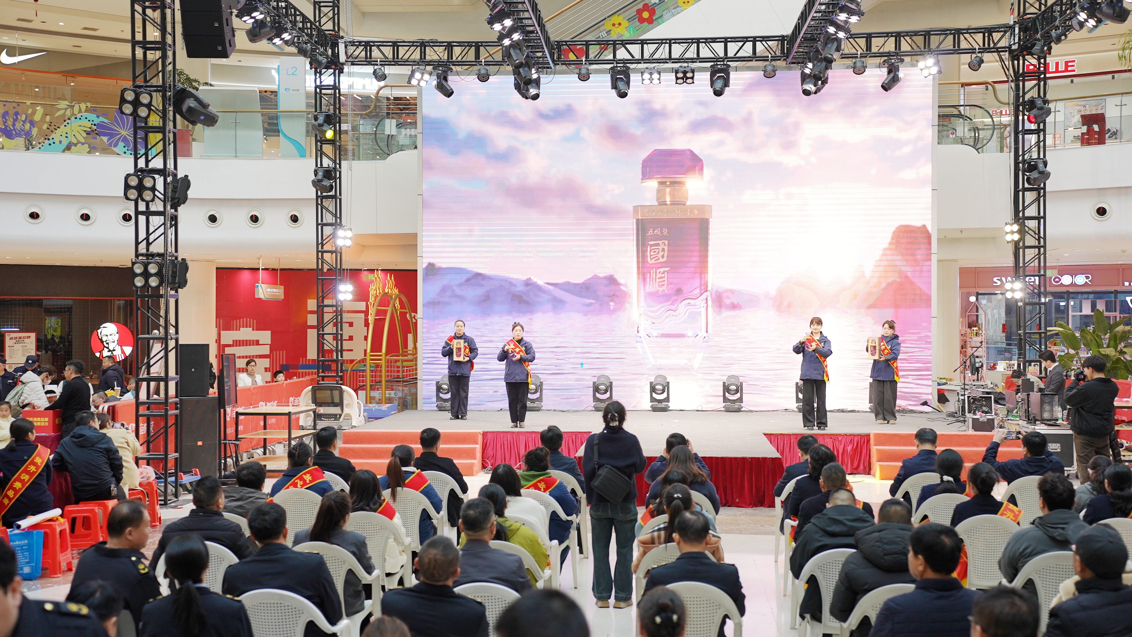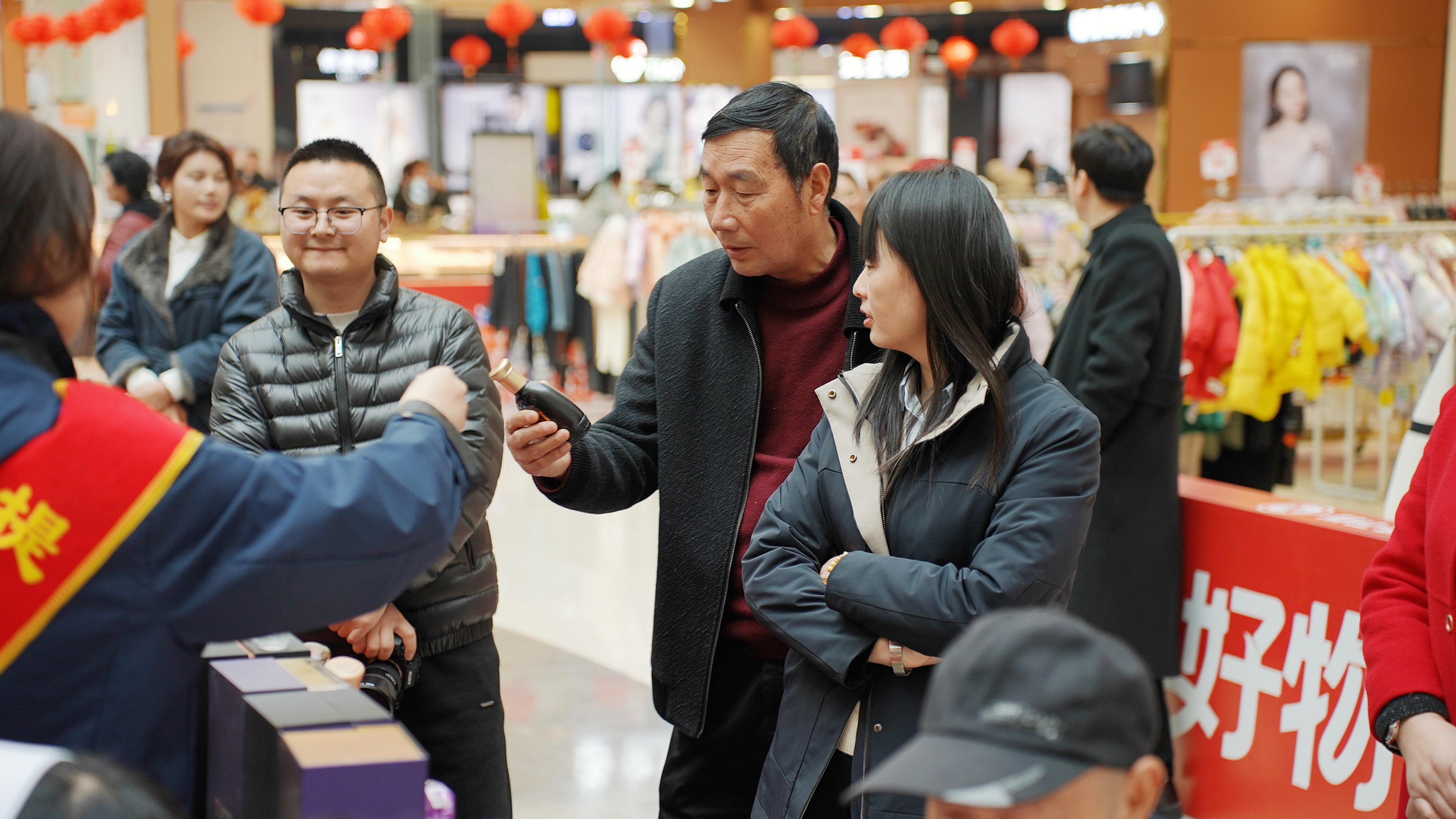 活动当天,商场中央设置了长三角及省市特色伴手礼产品展示区。伴随着五醍浆宣传片在大屏缓缓播放,工作人员手捧五醍浆·百顺S9礼盒、五醍浆·国顺两款获奖产品登台展示。其中,百顺S9礼盒以简约时尚的设计风格,将传统意蕴巧妙融入细节,精致讲究的礼盒包装吸引了众多消费者的注目;国顺系列则以经典“五醍浆紫”瓶身惊艳亮相,线条典雅大气,色泽莹润通透,于灯光流转间尽显尊贵品位。