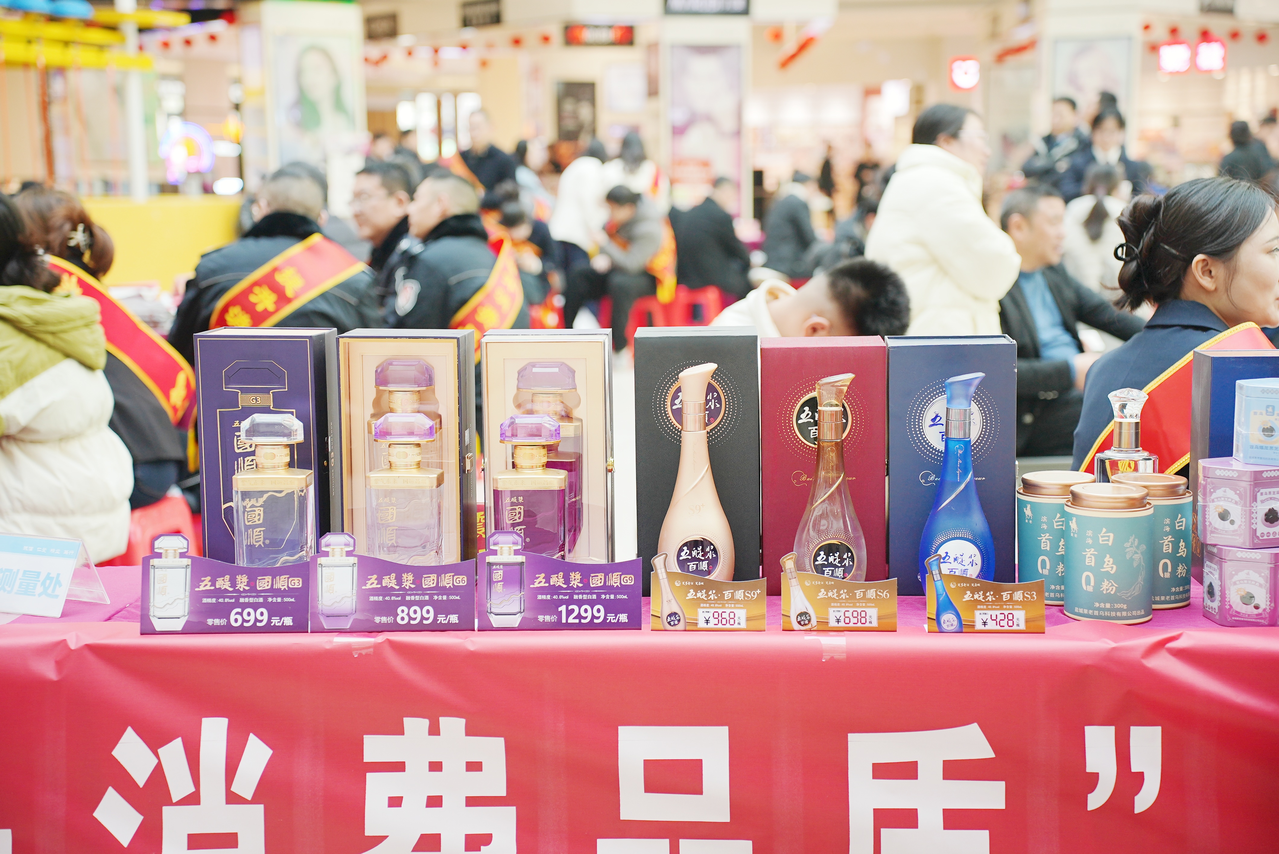 活动当天,商场中央设置了长三角及省市特色伴手礼产品展示区。伴随着五醍浆宣传片在大屏缓缓播放,工作人员手捧五醍浆·百顺S9礼盒、五醍浆·国顺两款获奖产品登台展示。其中,百顺S9礼盒以简约时尚的设计风格,将传统意蕴巧妙融入细节,精致讲究的礼盒包装吸引了众多消费者的注目;国顺系列则以经典“五醍浆紫”瓶身惊艳亮相,线条典雅大气,色泽莹润通透,于灯光流转间尽显尊贵品位。