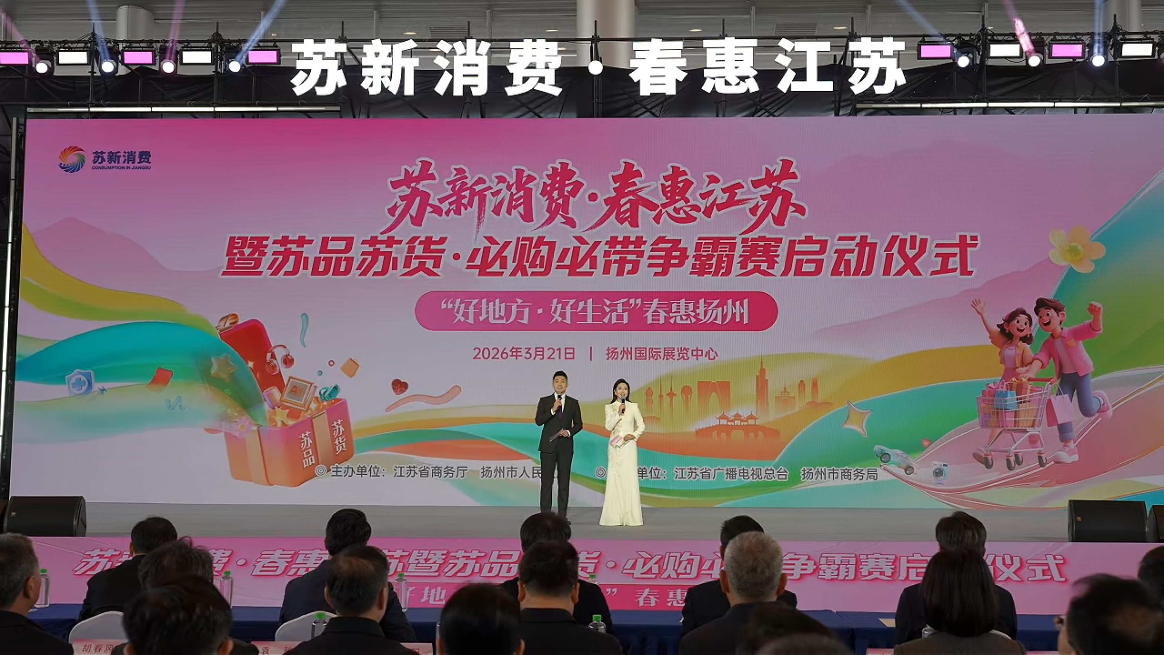 春日和煦,万物向新。3月20-22日,全省2026年“苏新消费·春惠江苏”暨“苏品苏货·必购必带争霸赛”在扬州国际展览中心盛大举办。江苏省副省长赵岩,省政府副秘书长徐华勤,省商务厅厅长司勇,扬州市委书记王进健,市委副书记、市长郑海涛,市委副书记、秘书长焦庆标等出席启动仪式。